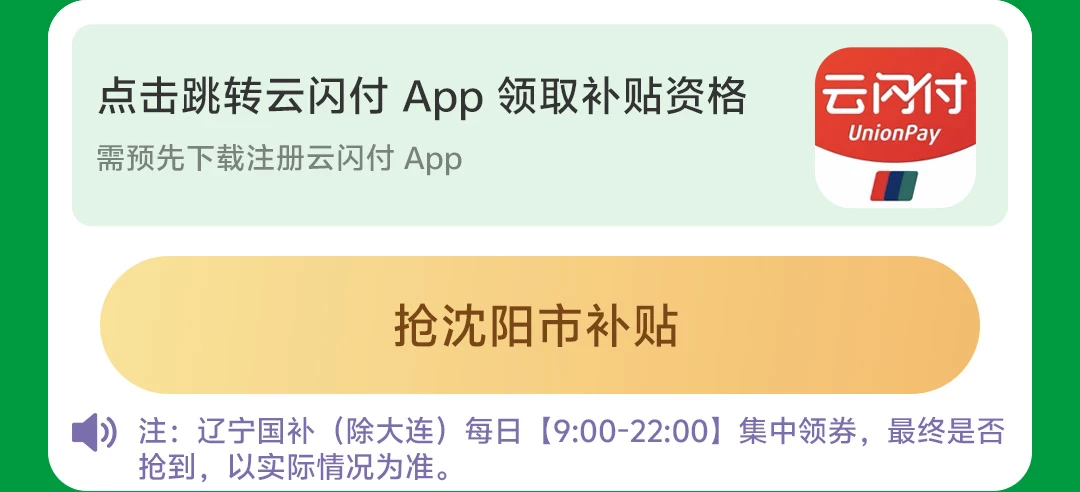 步骤三:点击“领取补贴”跳转至【云闪付】App根据页面提示操作,领取“沈阳市”补贴资格;