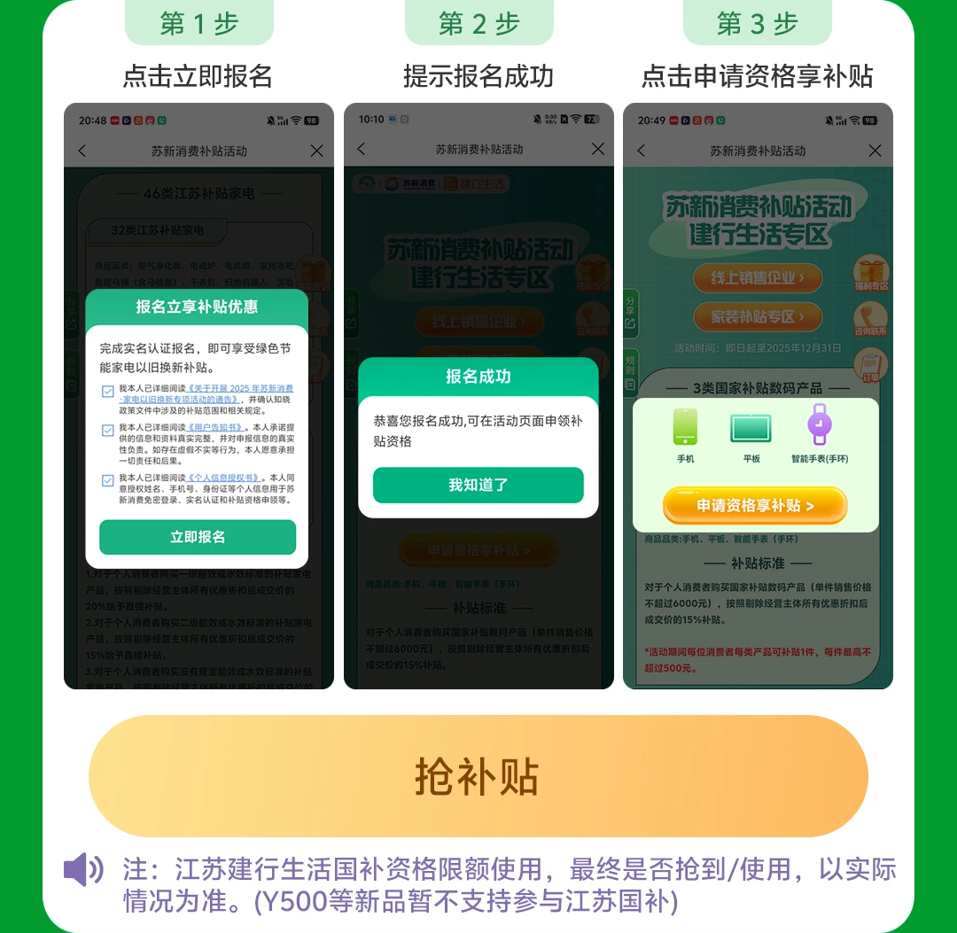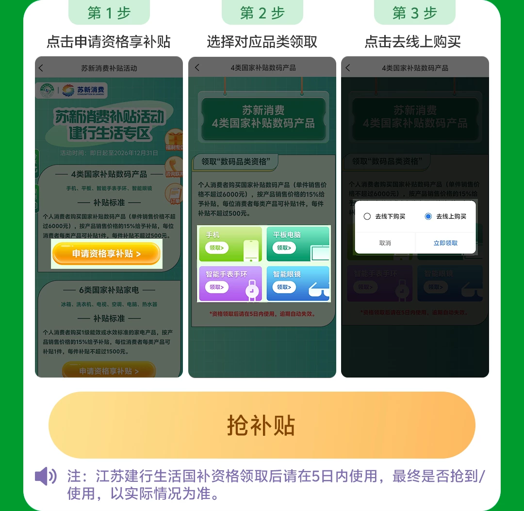 4、消费者需领取国家补贴和下单时所在地均为江苏省内,且收货地址位于江苏省内,才可享受补贴。