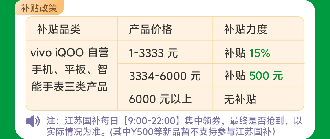 vivo/iQOO自营手机、平板、智能手表手环等3类数码产品(单件销售价格不超过6000元),按产品销售价格的15%给予补贴,每位消费者每类产品可补贴1件,每件补贴不超过500元。