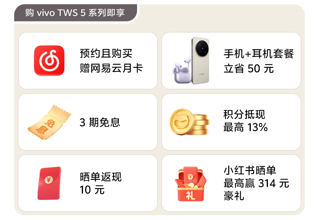 5、vivo TWS 5 系列 (价值以新品上市价格为准)*5个,中奖概率0.03%