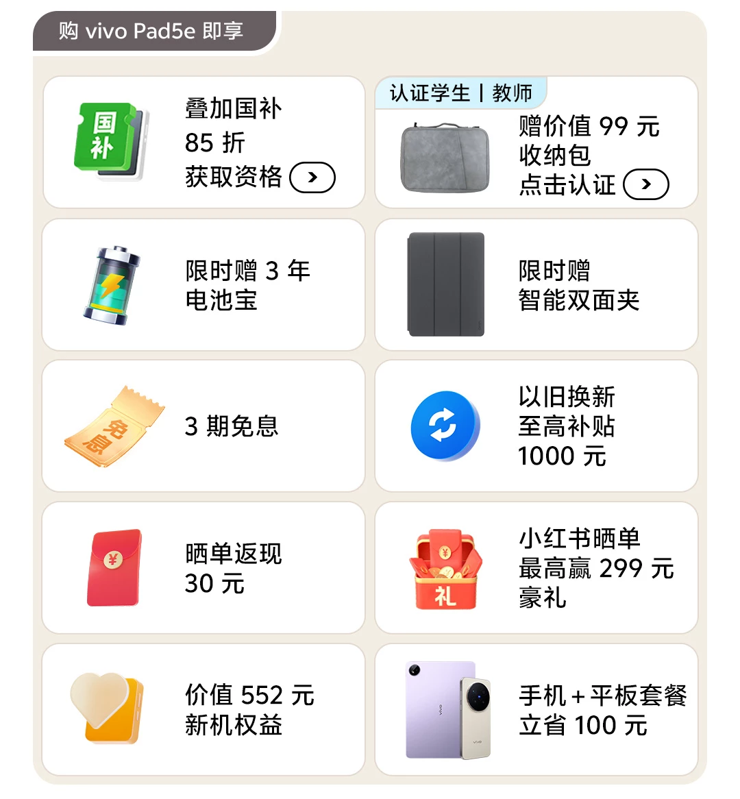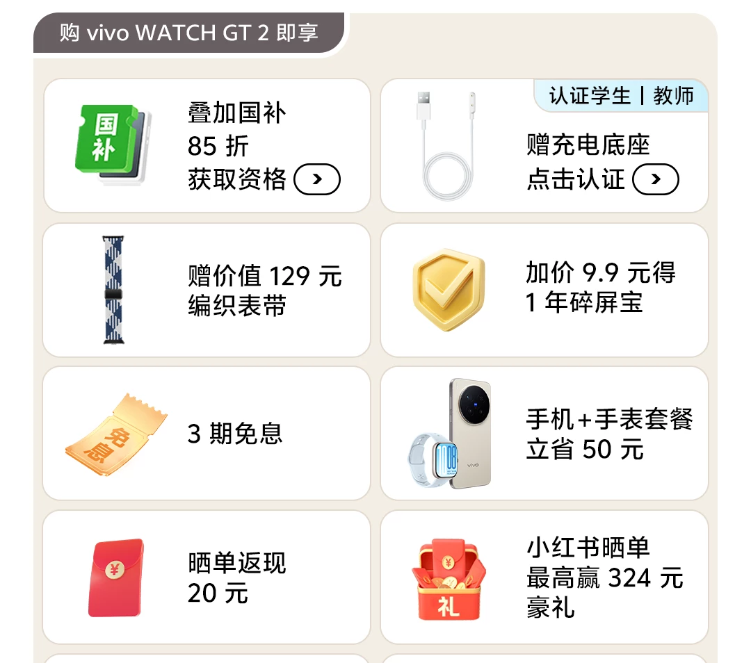 活动期间于vivo官方商城成功购买vivo X300系列/Pad 5e/WATCH GT2/TWS 5系列新品,即可享受对应福利内容,详情以新品商品详情页展示为准,敬请期待。赠品数量有限,先到先得。其中,vivo care+与新品权益包、碎屏宝买一年送一年权益不可同享。