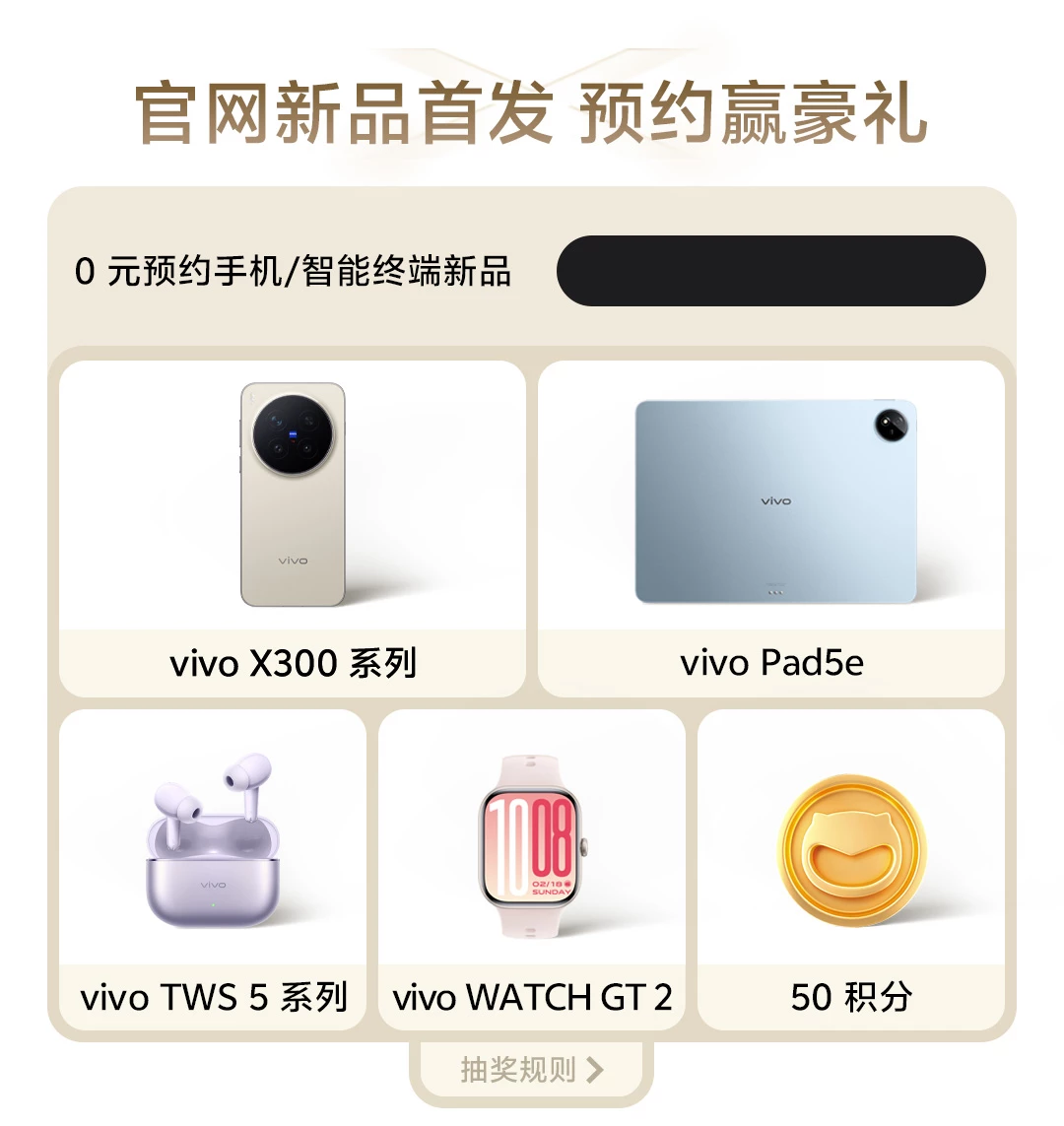 活动内容:活动期间,活动用户进入vivo官方商城的vivo X300系列新品预约活动页面,点击“预约抽奖”即可预约新品并参与抽奖,由系统自动完成抽奖。即时可在页面查看抽奖结果,有机会抽中如下奖品其中1个。