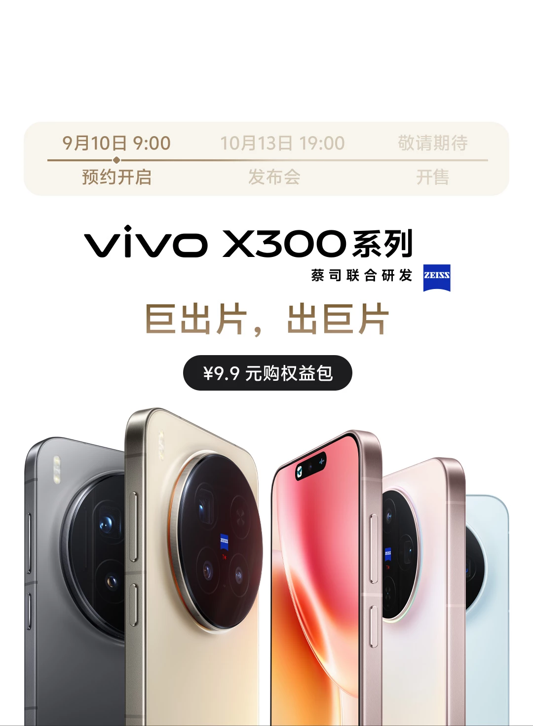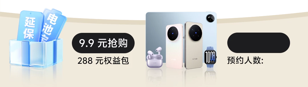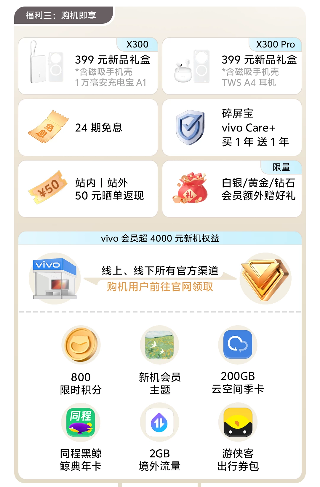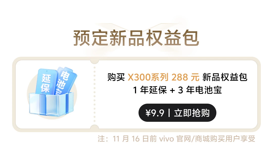 活动内容:活动期间,用户进入vivo商城支付9.9元成功购买X300系列新品权益包。并于2025年11月16日24点前,在vivo商城成功购买X300系列新机,可享新品权益包福利。