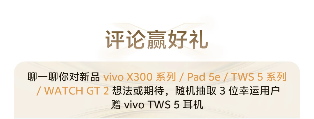 活动内容:新品预约期间,在vivo官方商城的vivo X300系列新品预约活动页面新品预约活动页面参与评论盖楼活动,说一说您对vivo X300系列/vivo Pad 5e/vivo WATCH GT2/