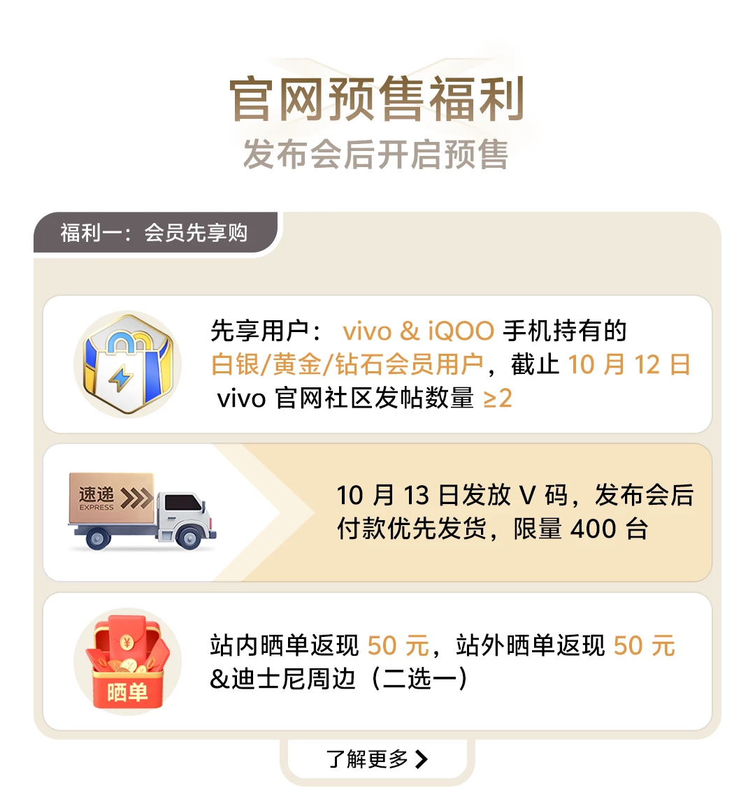 参与方式:活动期间,vivo商城限量开放X300系列新品给获得V码礼包资格并成功绑定添加用户购买,新品预售开启后,进入v码抢购页面,成功购买X300系列新品后,可以享受预售期内优先发货,快人一步体验新品手机。