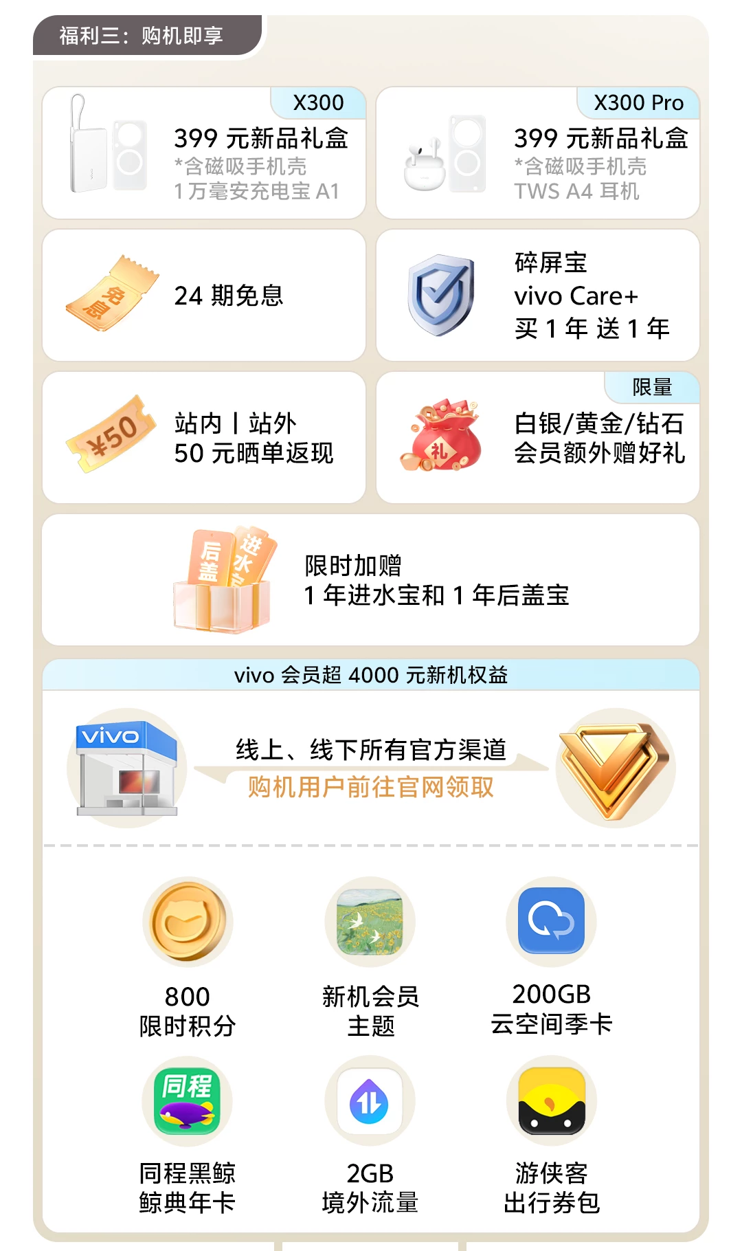 活动期间于vivo官方商城成功购买vivo X300系列/Pad 5e/WATCH GT2/TWS 5系列新品,即可享受对应福利内容,详情以新品商品详情页展示为准,敬请期待。赠品数量有限,先到先得。其中,vivo care+与新品权益包、碎屏宝买一年送一年权益不可同享。
