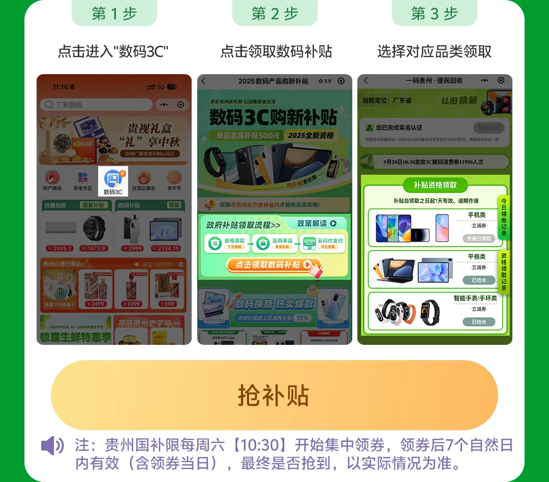 步骤三:点击“抢补贴”进入微信小程序“一码贵州”平台数码页面,领取对应类型数码补贴券,并确认收货地址在贵州省内;
