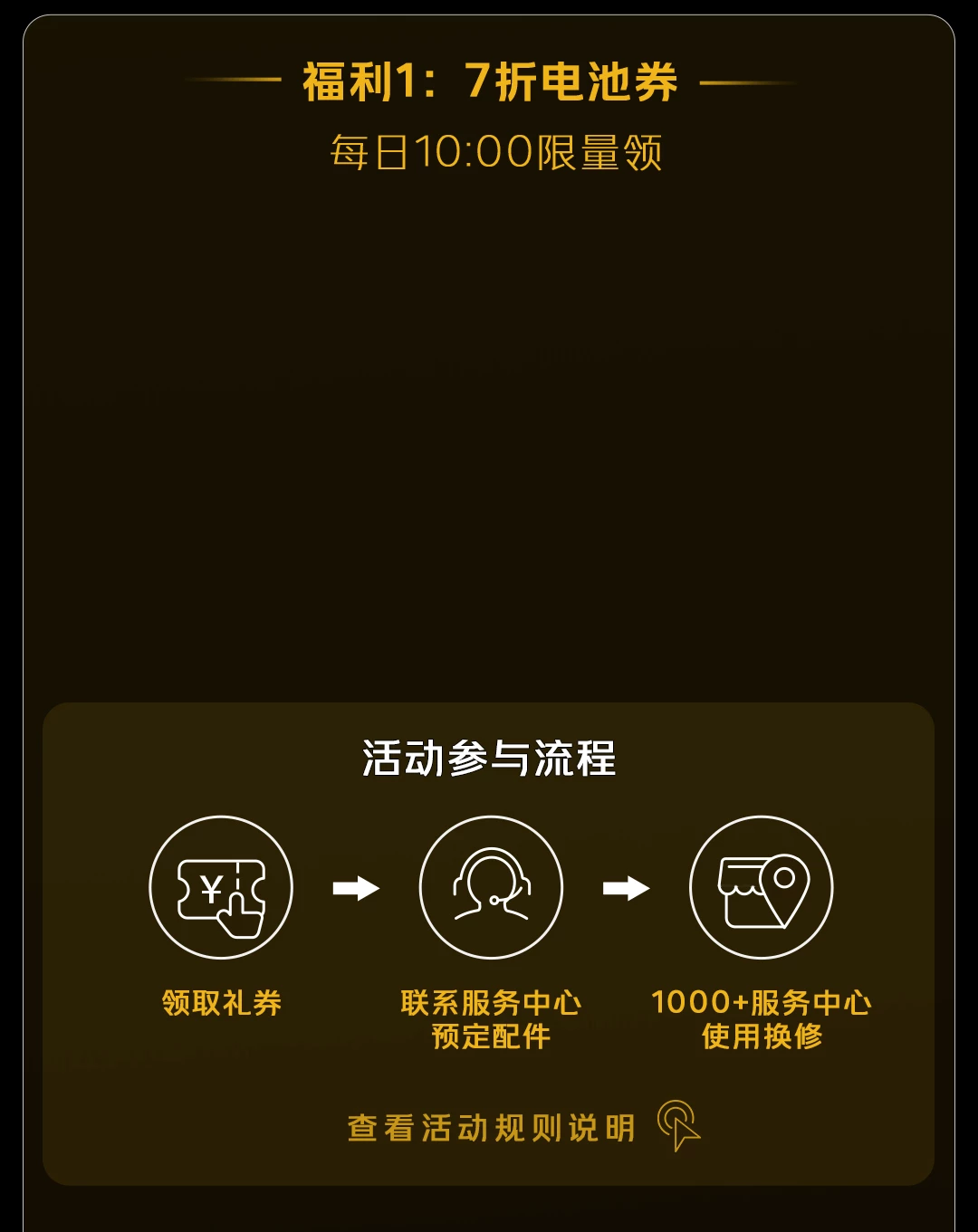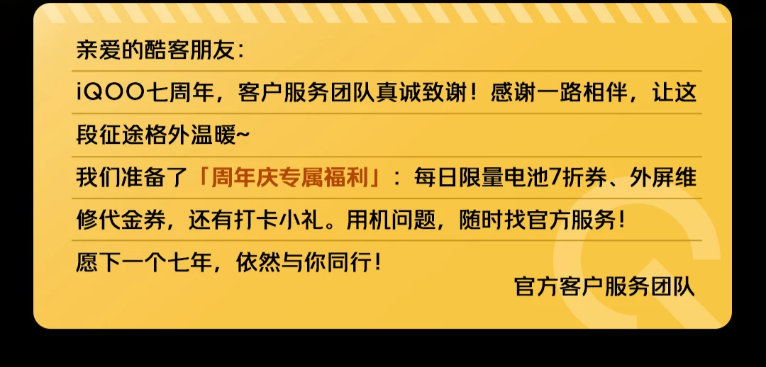 【礼券内容】iQOO 品牌手机机型享受七折电池焕新优惠。共计发放120,000张,领完即止,先到先得。