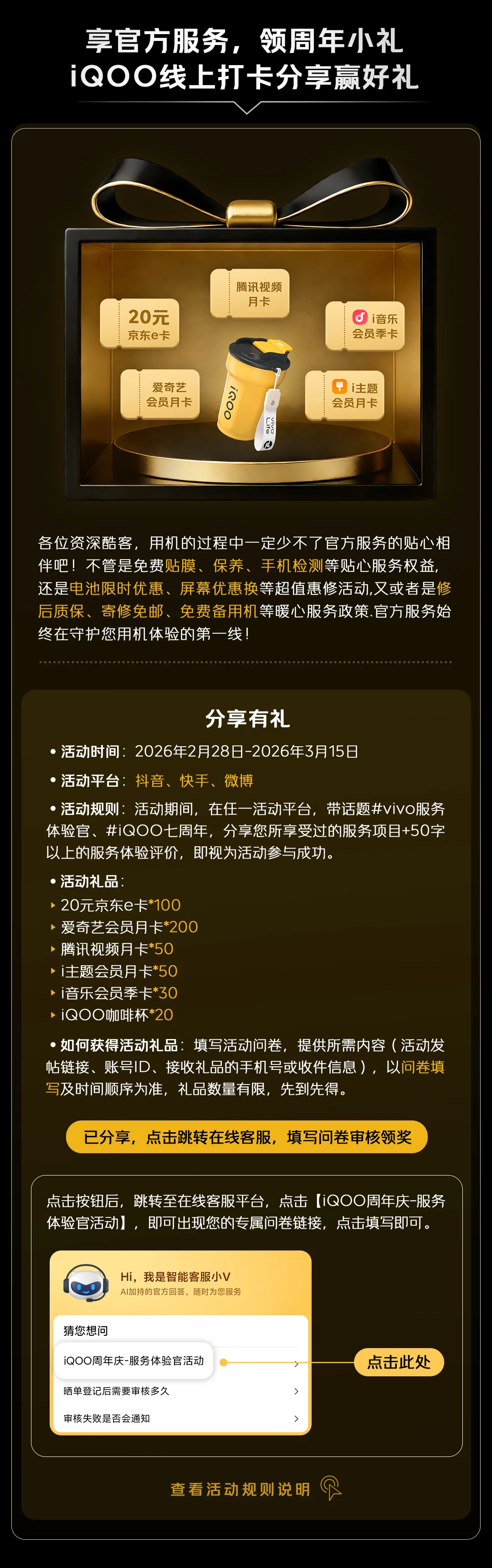 2、 如何参与活动:点击活动页面问卷按钮进入首页,选择“iQOO周年庆-服务体验官活动”即可填写问卷信息,提交成功即可进入审核。