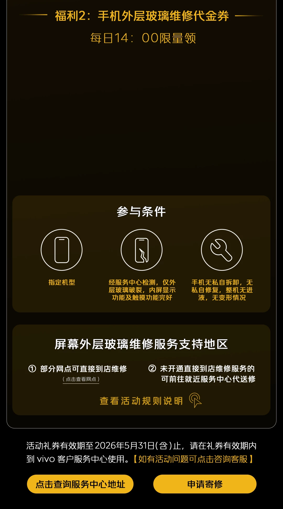 【礼券内容】指定iQOO品牌手机机型享受外层玻璃维修减免20元优惠。共计发放10,000张,领完即止,先到先得。