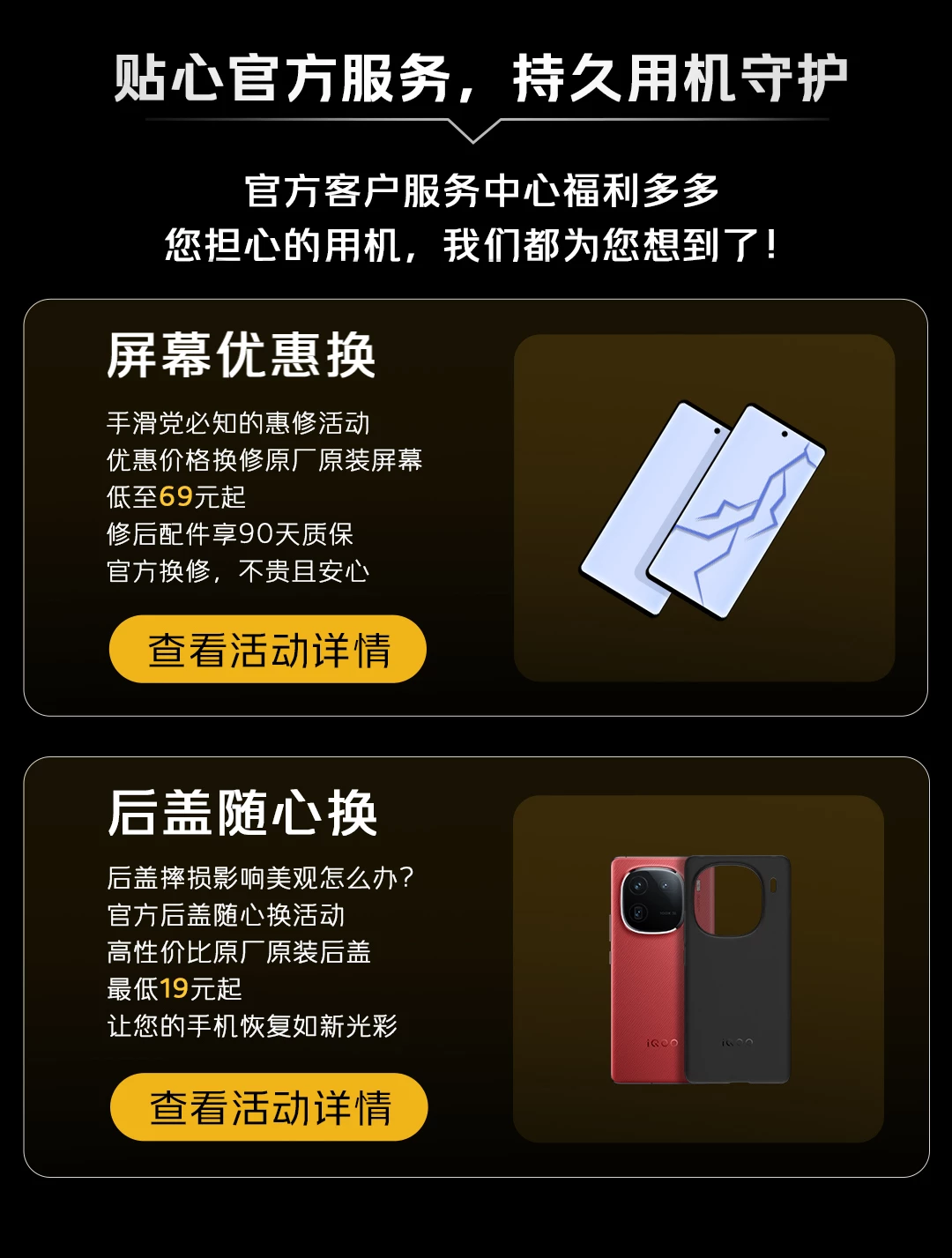 【参与机型】iQOO品牌手机机型(受配件供应影响,iQOO Neo/iQOO Pro 5G/iQOO Pro/iQOO 3/iQOO 3变形金刚限量版/iQOO Neo9/iQOO Neo9S Pro/iQOO Neo9 Pro/iQOO Neo7不参与本次活动。不参与机型用户可点击留下个人信息,后续将有相应的福利补发给您)