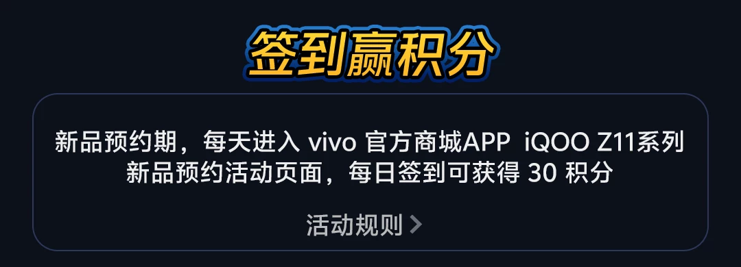 活动内容: 新品预约期,用户可每天进入vivo官方商城iQOO Z11系列新品预约活动页面签到得积分,每日签到可获得30积分,签满8天累计可得240积分。