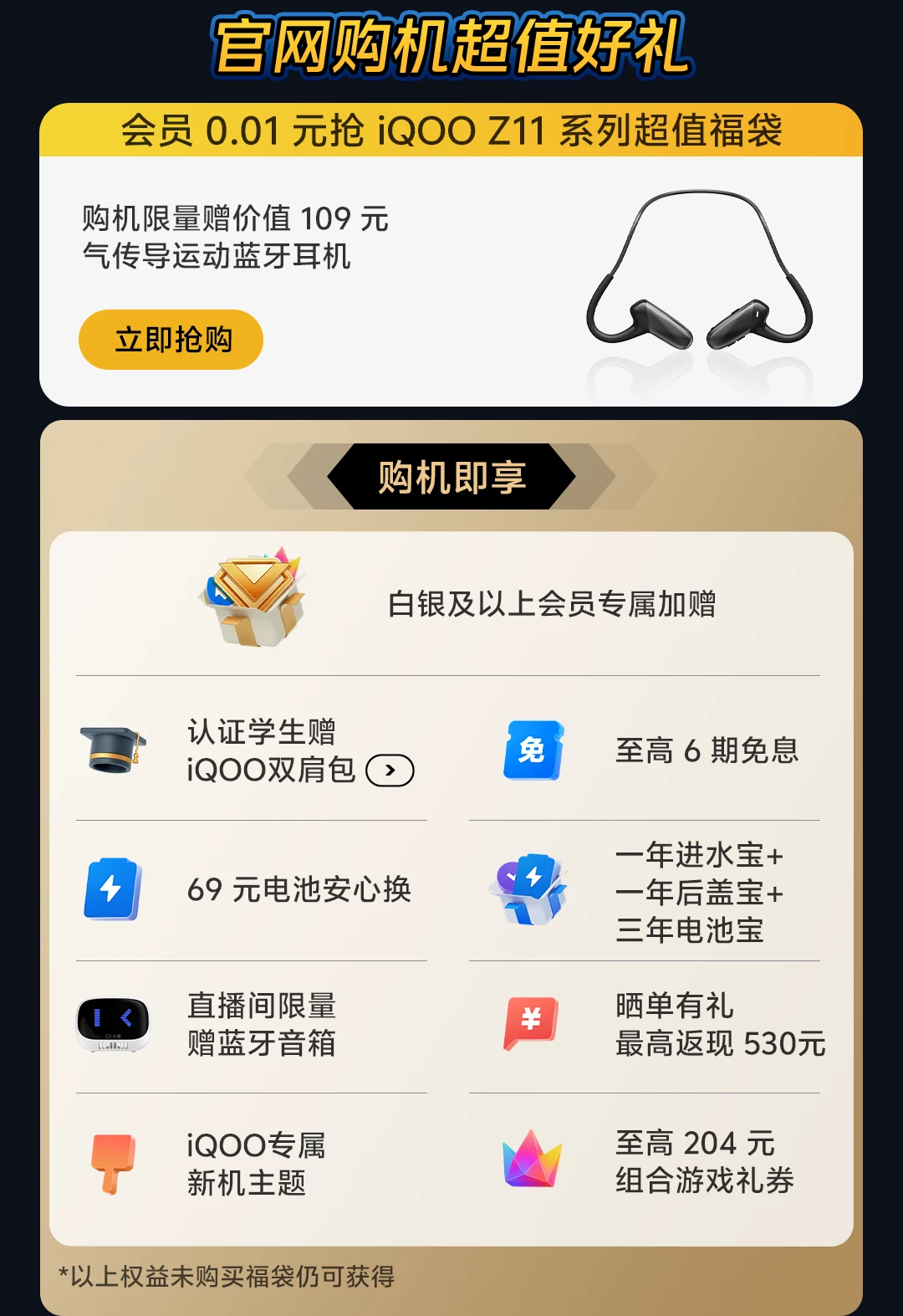 2、购iQOO Z11&Z11x新品福袋需与购买iQOO Z11/Z11x手机的vivo账号保持一致,才可享受该权益。